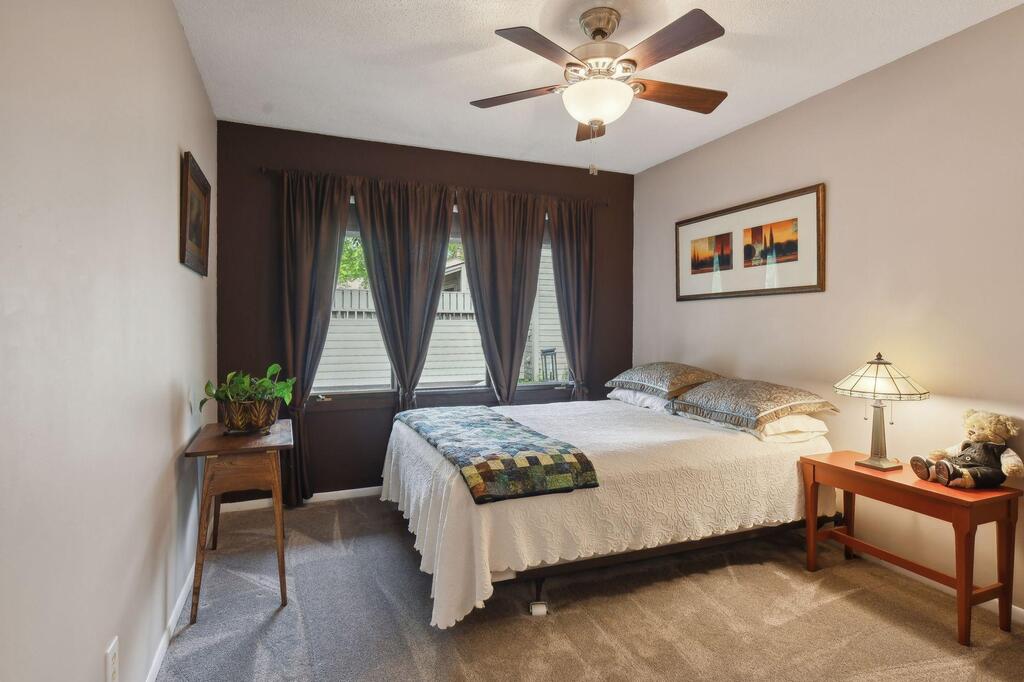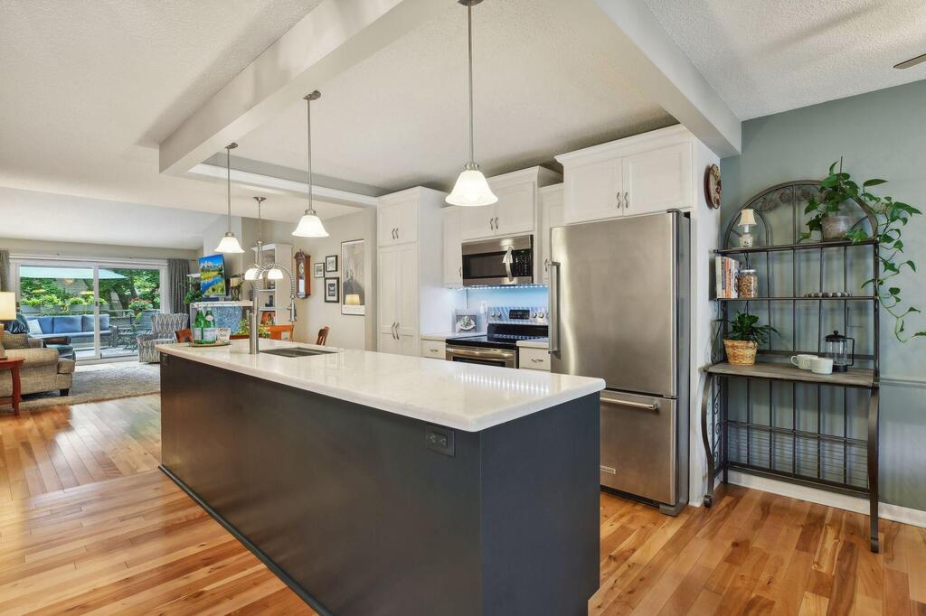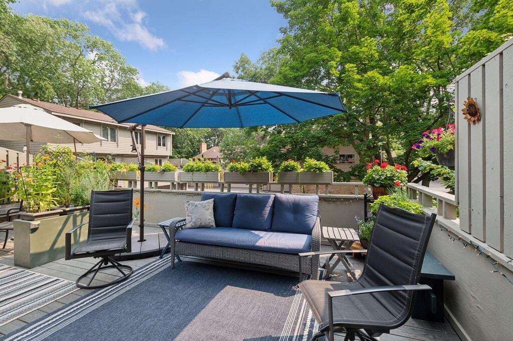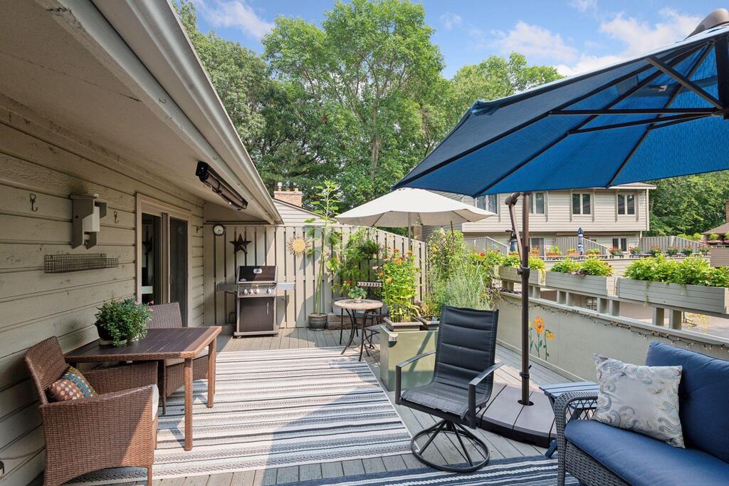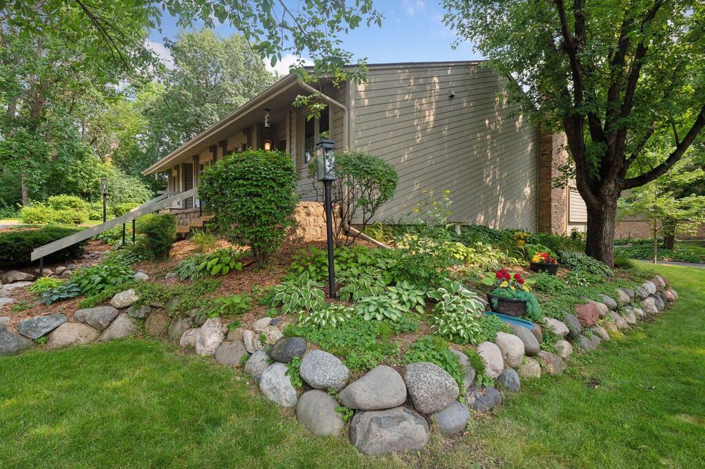 Gorgeous end unit townhome with beautiful yard/landscaping, situated nicely in sought after W. Bloomington location! Open/spacious main level with front-to-back sunlight / new T&G wood flooring & metal/wire railing! Modern kit with white cabinetry. 10ft center island, new quartz CT's, undermount sink, & SS appliances. Cozy informal dining plus larger dining area off kit. Vaulted LR boasts stone/gas FP & walks out to incredible, yard-like 25 x15 deck! This private oasis is like an addition to home & provides awesome outdoor space and includes natural gas grill! Huge vaulted owners BR with 2 closets walks out to outdoor living area. 2nd main level BR has office space built in to closet. Main level bath with new high-end vanity & CT. Loer level has good sized fam rm, 3rd BR/office, ¾ bath, finished 10 x 10 storage rm (could have many uses), laundry/craft rm & walks out to 2+ car gar! Other updates include 6 panel doors & lighting. Enjoy community center & in-ground pool area. Nice!