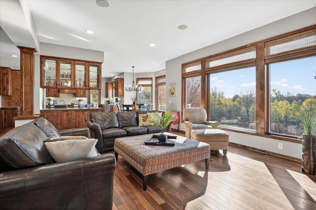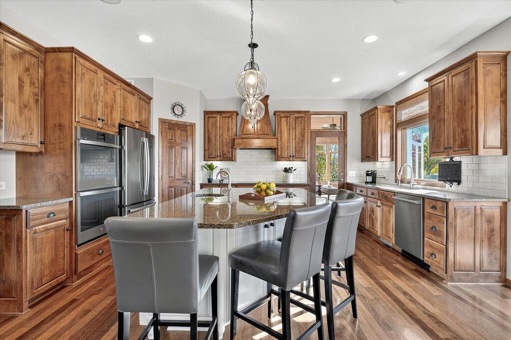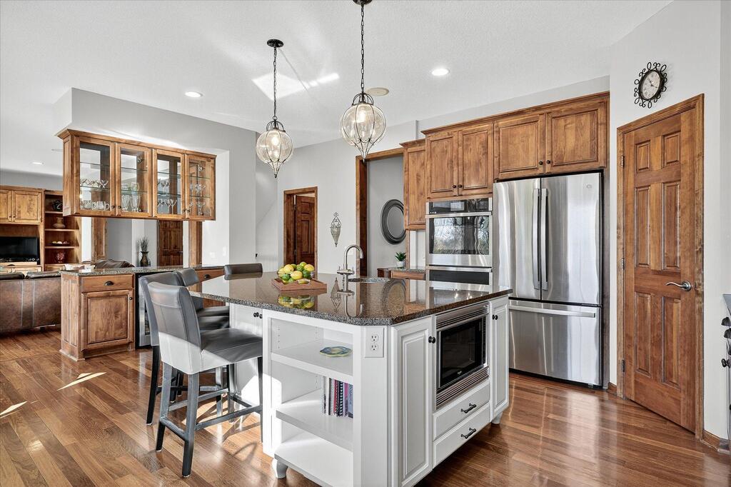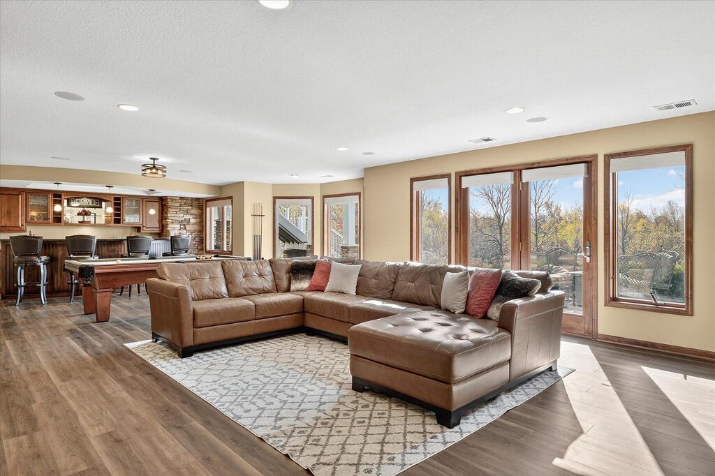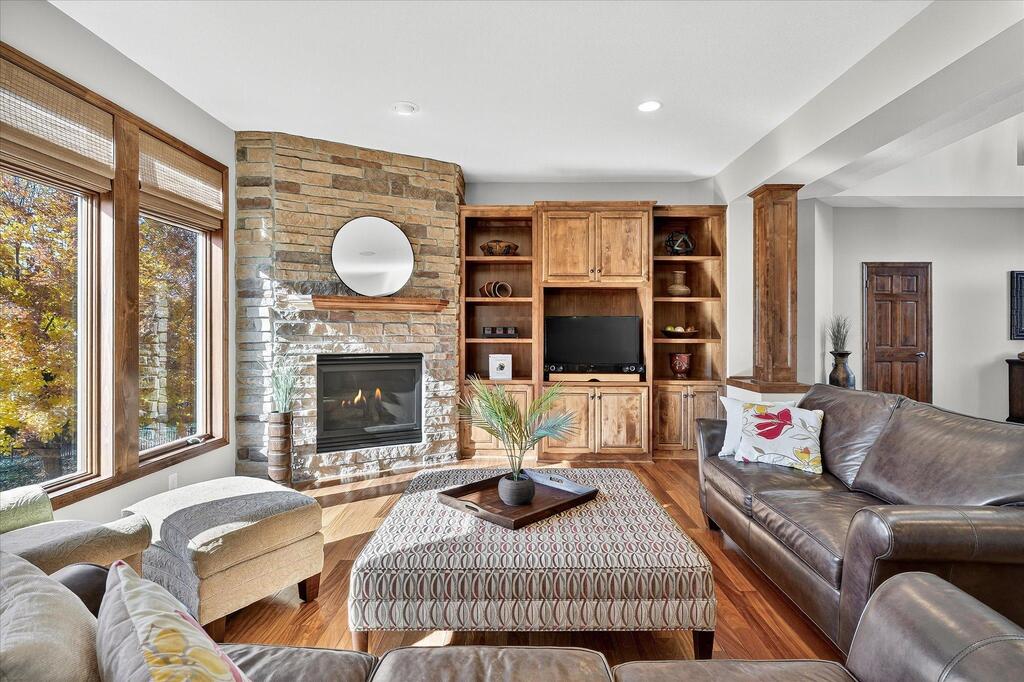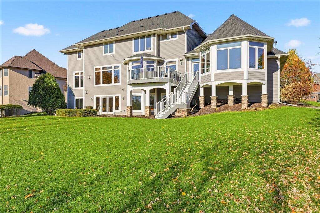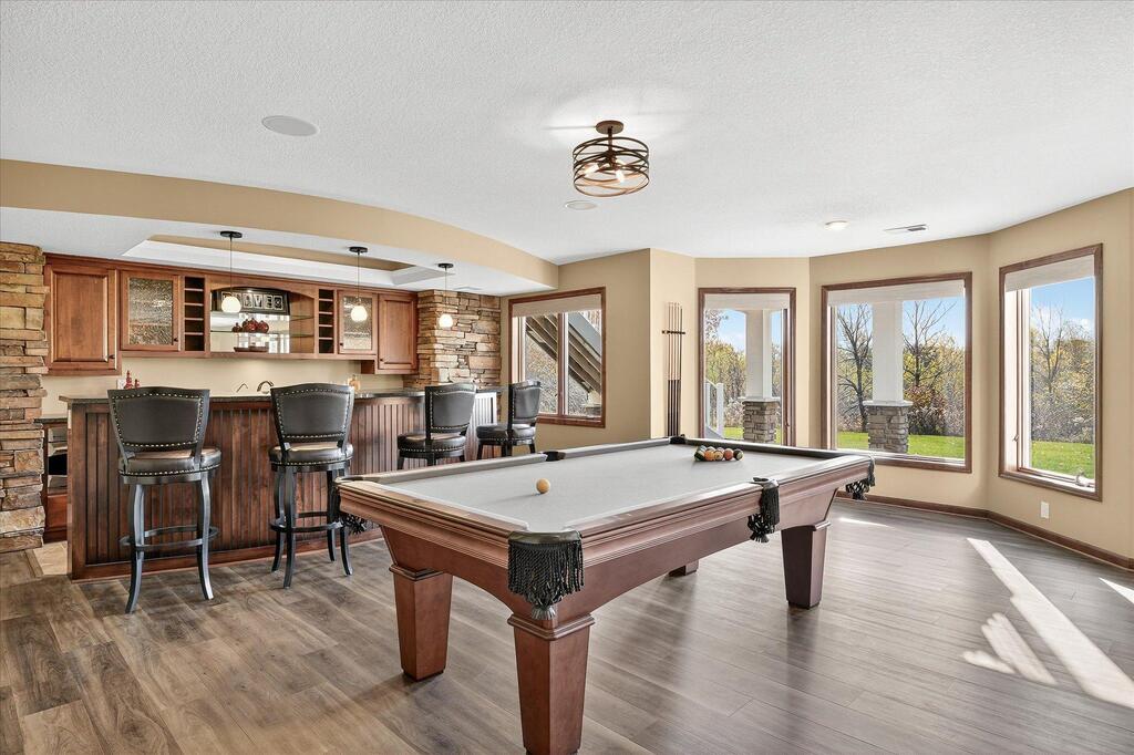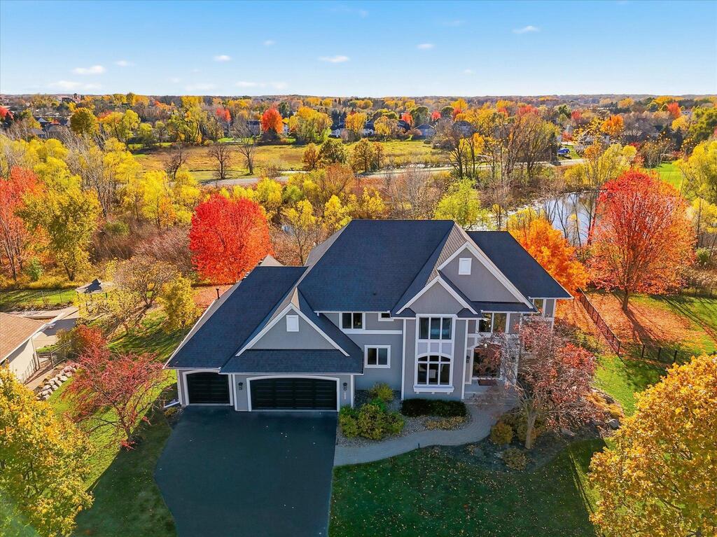 Luxury living in a premier location! Welcome to this stunning 2-story home, situated nicely on a private 1/2-acre lot in Wild Meadows, one of the most desirable neighborhoods in Medina! Just steps from prestigious Medina golf & country club, scenic parks, walking paths, & close to shopping. This conservation community has 345 acres filled with miles of private resident trails & protected wooded/natural areas. Step into the grand 2-story foyer which is open to upper level & enjoys front to back light. The main level fam room is flooded with natural light from expansive windows that frame serene views of a private, wooded lot & tranquil pond & features a striking stone fireplace with a rich wood mantel flanked by built-in shelving. Elegant wood pillars add warmth & architectural charm. Brazilian cherry wood floors flow throughout the main level, leading to the gourmet kitchen, boasting clear alder cabinetry, granite countertops, a beveled subway tile backsplash, & a walk-in pantry. You will appreciate the double wall ovens with convection heating, induction cooktop, & a generous island with seating for four, complemented by an informal dining area. A thoughtfully designed peninsula with added storage & counterspace has a built-in wine fridge & creates a stylish transition between the kit & fam room, enhancing both function & flow. When guests arrive, the spacious formal dining room is perfect for entertaining. French doors off the foyer lead to main level office with an added nook for a desk/work area. Elevated windows provide both extra light & privacy. Enjoy the changing seasons in the 3-season porch featuring in-floor heat & full-view windows overlooking the backyard & woods. Step out onto the maint-free deck for outdoor relaxation. The main level also includes a laundry room with sink/storage/workspace, a mudroom with locker-style storage/large closet, & a convenient half bath. Ascend the open staircase to the upper level, which offers 4 BR's. French doors lead to spacious owner's suite featuring a luxurious bath with wraparound double sinks, white tile finishes, a soaking tub, a glass-enclosed shower, a private water closet, & a custom-organized walk-in closet. 2 additional BR's share a full Jack & Jill bath with double sinks, while the 4th BR serves as a 2nd suite with its own 3/4 bath, walk-in closet, & elevated windows. The walk-out lower level is designed for fun & relaxation. A generously sized fam room with a stone fireplace & built-in benches flows into a custom wet bar area with rich wood cabinetry, granite counters, stone accents, & full appliances. The billiards area sits between the bar & fam room. Step outside to the paver patio & enjoy the park-like yard. 5th BR, 3/4 bath & tons of storage complete the basement. Built-in speakers in many rooms. Oversized 3 car gar with added 25 x 12 heated/insulated workshop (listed as outbuilding). New roof. See supplement for additional updates. This home offers the perfect blend of luxury, comfort, & location. Don’t miss your opportunity to own a truly exceptional property in Wayzata School Dist.