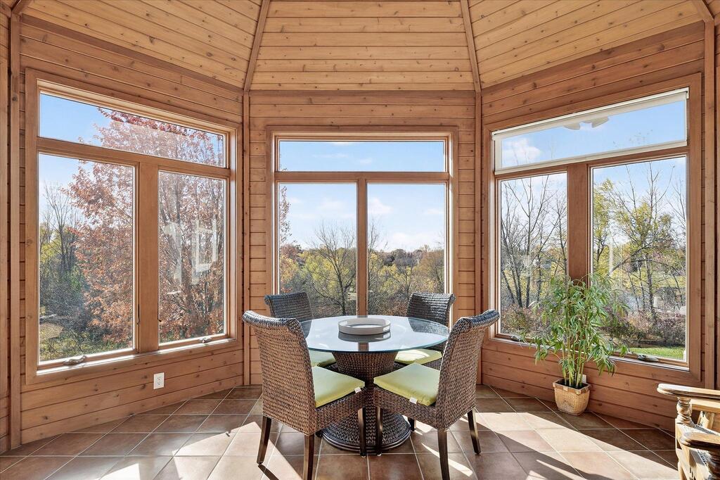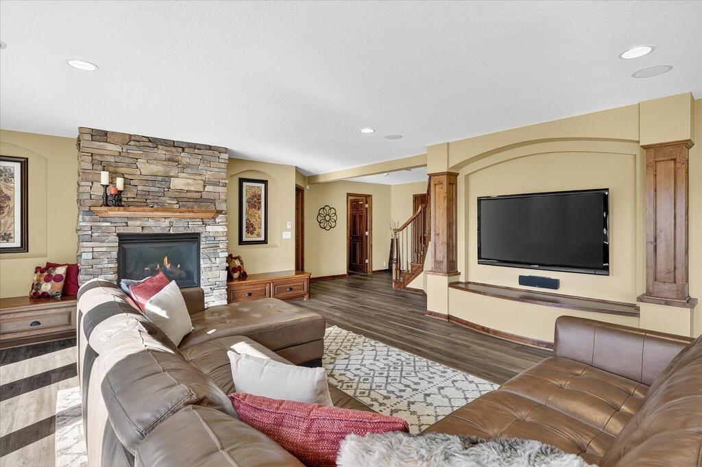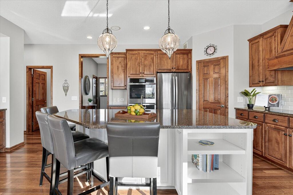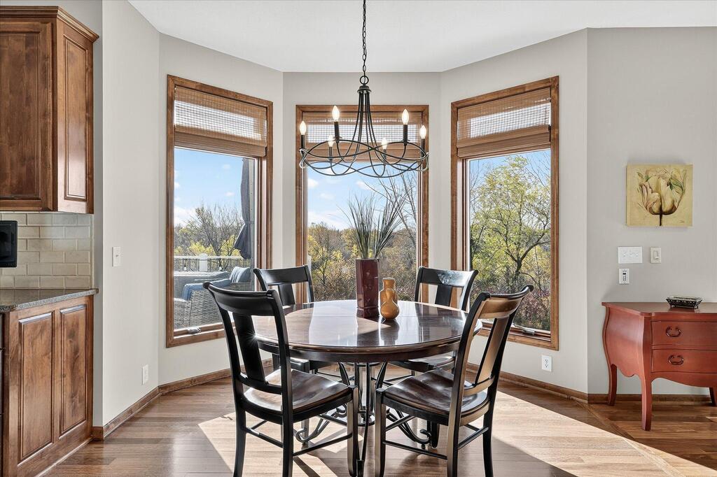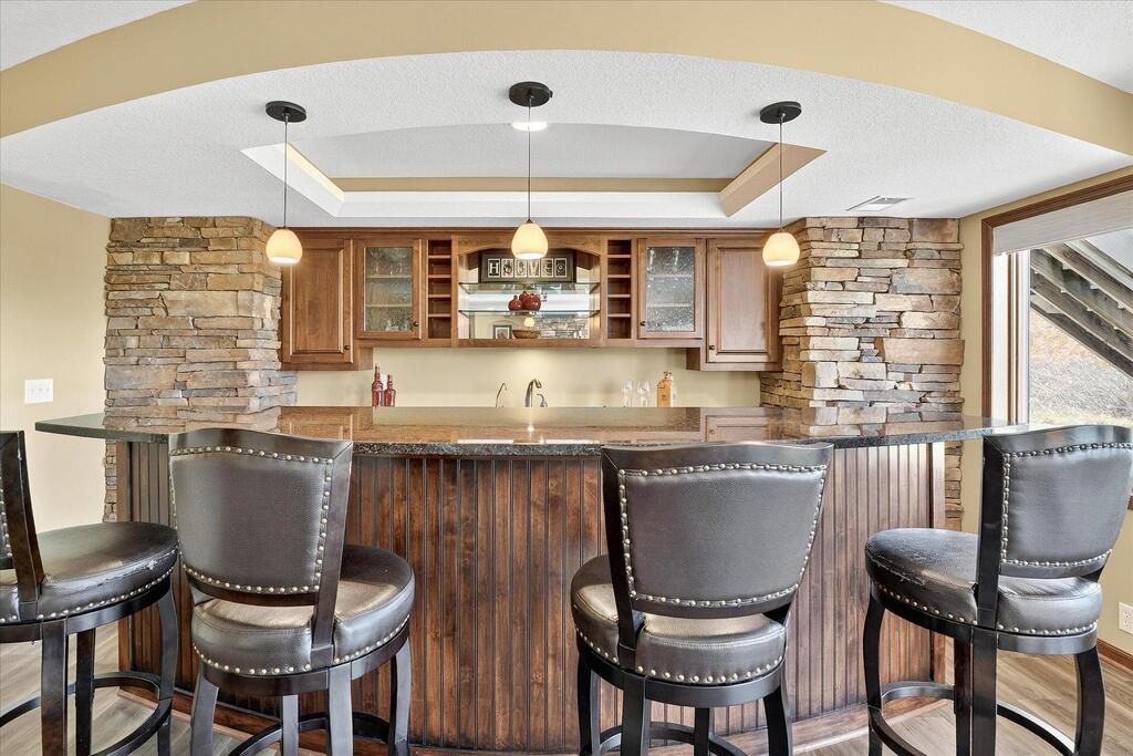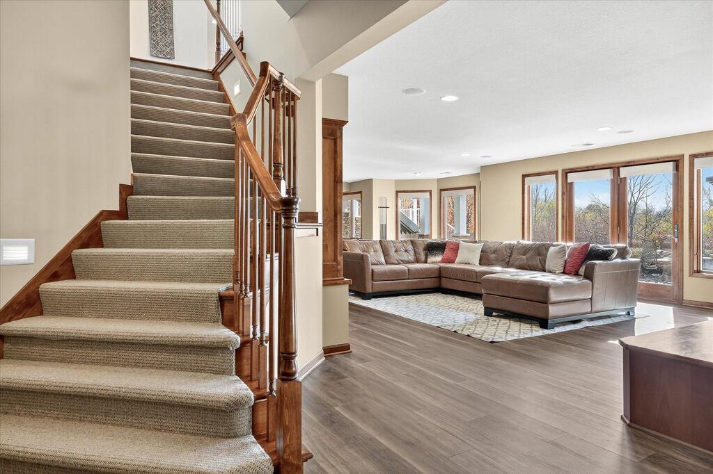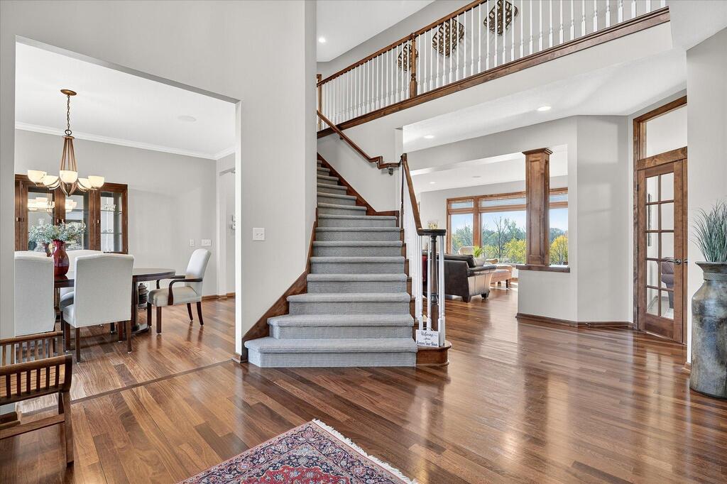 Luxury living in a premier location! Welcome to this stunning 2-story home, situated nicely on a private 1/2-acre lot in Wild Meadows, one of the most desirable neighborhoods in Medina! Just steps from prestigious Medina golf & country club, scenic parks, walking paths, & close to shopping. This conservation community has 345 acres filled with miles of private resident trails & protected wooded/natural areas. Step into the grand 2-story foyer which is open to upper level & enjoys front to back light. The main level fam room is flooded with natural light from expansive windows that frame serene views of a private, wooded lot & tranquil pond & features a striking stone fireplace with a rich wood mantel flanked by built-in shelving. Elegant wood pillars add warmth & architectural charm. Brazilian cherry wood floors flow throughout the main level, leading to the gourmet kitchen, boasting clear alder cabinetry, granite countertops, a beveled subway tile backsplash, & a walk-in pantry. You will appreciate the double wall ovens with convection heating, induction cooktop, & a generous island with seating for four, complemented by an informal dining area. A thoughtfully designed peninsula with added storage & counterspace has a built-in wine fridge & creates a stylish transition between the kit & fam room, enhancing both function & flow. When guests arrive, the spacious formal dining room is perfect for entertaining. French doors off the foyer lead to main level office with an added nook for a desk/work area. Elevated windows provide both extra light & privacy. Enjoy the changing seasons in the 3-season porch featuring in-floor heat & full-view windows overlooking the backyard & woods. Step out onto the maint-free deck for outdoor relaxation. The main level also includes a laundry room with sink/storage/workspace, a mudroom with locker-style storage/large closet, & a convenient half bath. Ascend the open staircase to the upper level, which offers 4 BR's. French doors lead to spacious owner's suite featuring a luxurious bath with wraparound double sinks, white tile finishes, a soaking tub, a glass-enclosed shower, a private water closet, & a custom-organized walk-in closet. 2 additional BR's share a full Jack & Jill bath with double sinks, while the 4th BR serves as a 2nd suite with its own 3/4 bath, walk-in closet, & elevated windows. The walk-out lower level is designed for fun & relaxation. A generously sized fam room with a stone fireplace & built-in benches flows into a custom wet bar area with rich wood cabinetry, granite counters, stone accents, & full appliances. The billiards area sits between the bar & fam room. Step outside to the paver patio & enjoy the park-like yard. 5th BR, 3/4 bath & tons of storage complete the basement. Built-in speakers in many rooms. Oversized 3 car gar with added 25 x 12 heated/insulated workshop (listed as outbuilding). New roof. See supplement for additional updates. This home offers the perfect blend of luxury, comfort, & location. Don’t miss your opportunity to own a truly exceptional property in Wayzata School Dist.